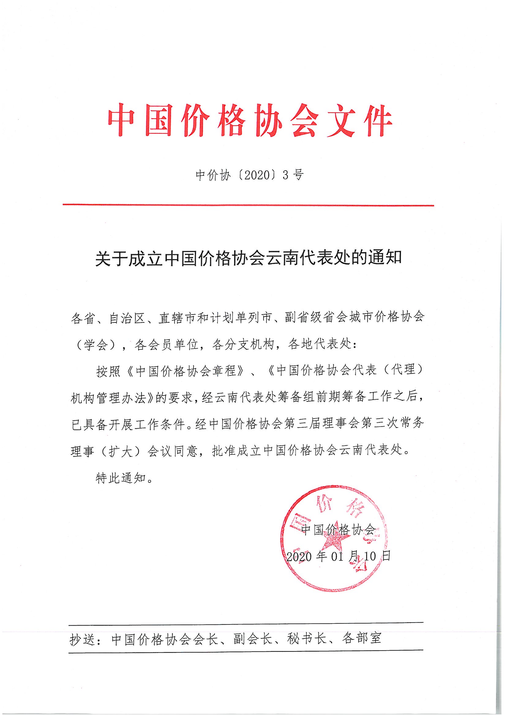 > 关于成立中国价格协会云南代表处的通知-中价协【2020】3号