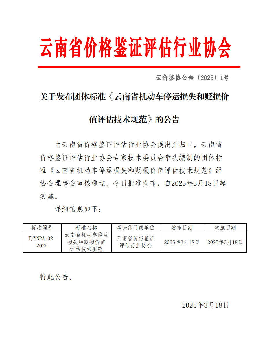 > 关于发布团体标准《云南省机动车停运损失和贬损价值评估技术规范》的公告