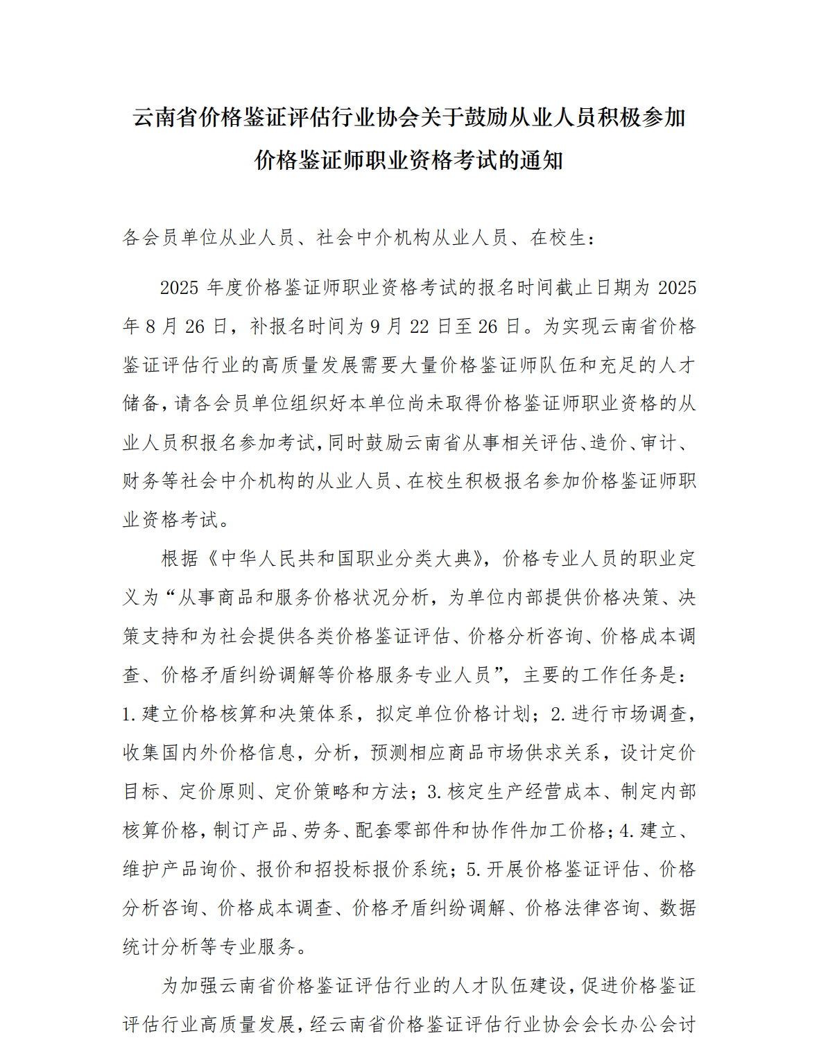 正文:云南省价格鉴证评估行业协会关于鼓励从业人员积极参加价格鉴证师职业资格考试的通知