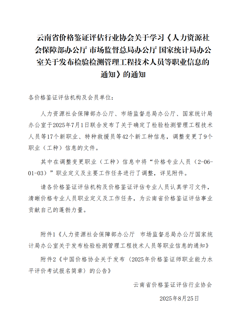 正文:云南省价格鉴证评估行业协会关于学习《人力资源社会保障部办公厅市场监督总局办公厅国家统计局办公室关于发布检验检测管理工程技术人员等职业信息的通知》