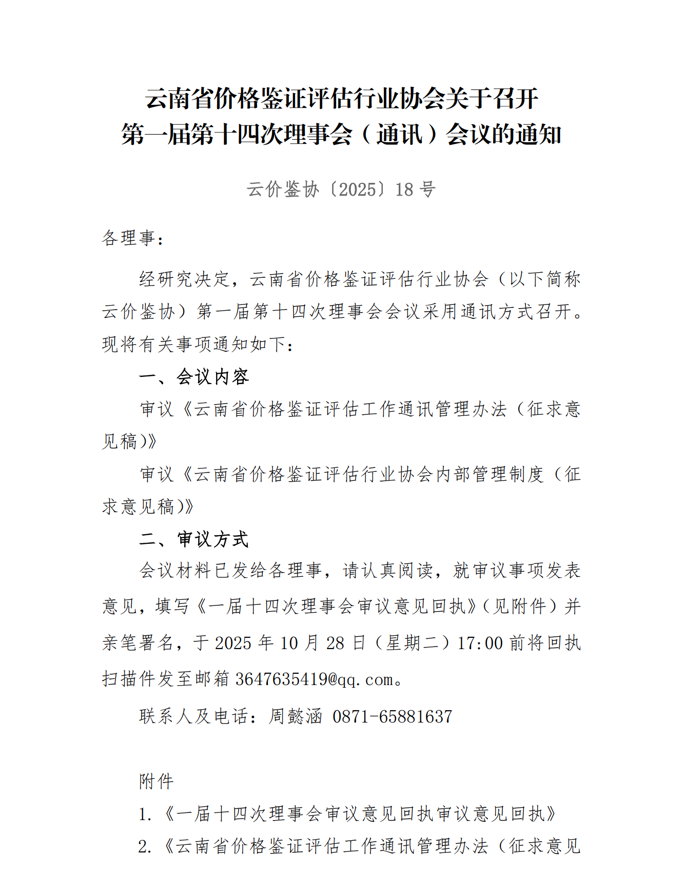 关于召开 第一届第十四次理事会(通讯)会议的通知