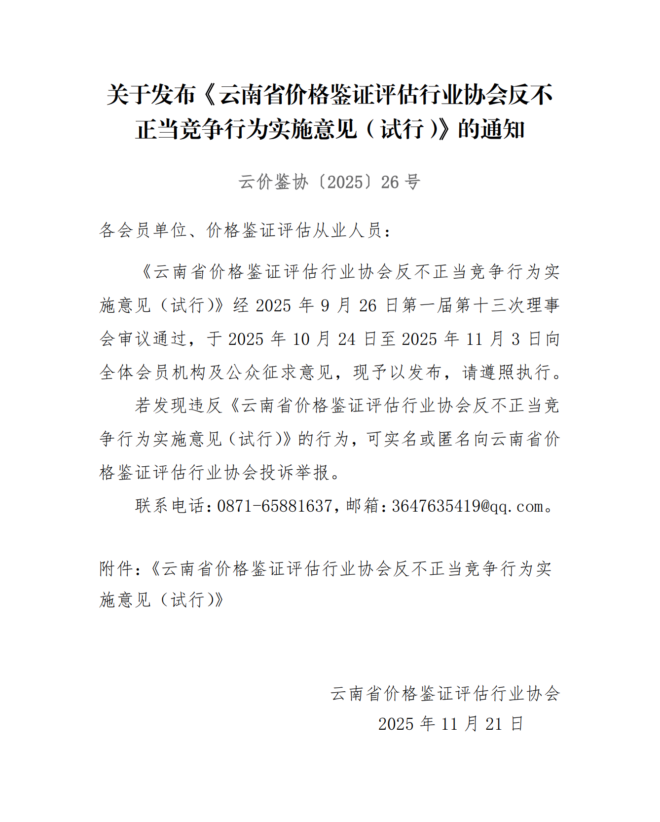 关于发布《云南省价格鉴证评估行业协会反不正当竞争行为实施意见(试行)》的通知