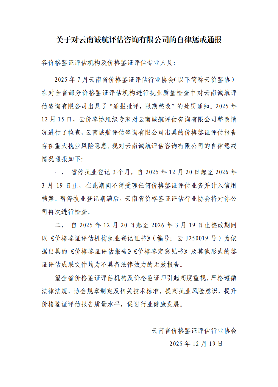 关于对云南诚航评估咨询有限公司的自律惩戒通报