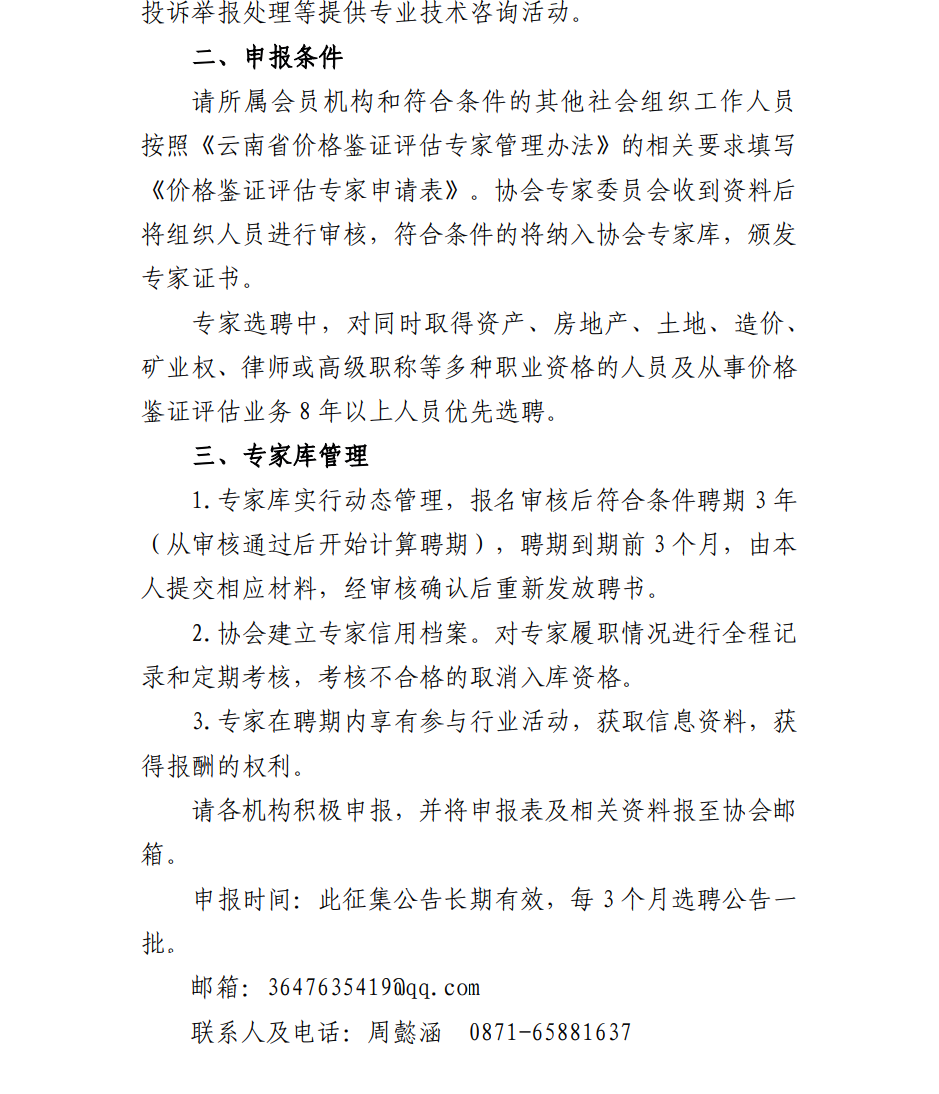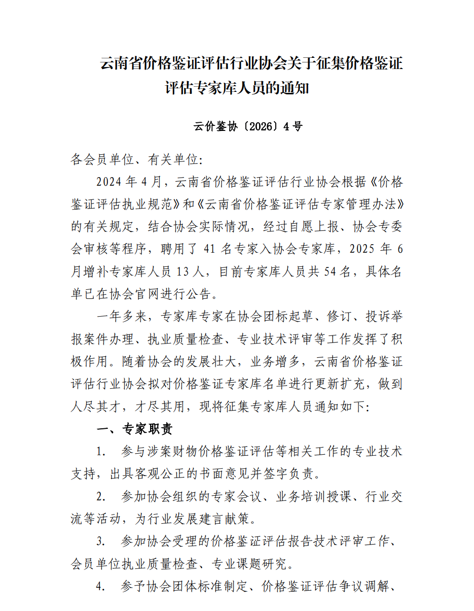 云南省价格鉴证评估行业协会征集专家库人选通知