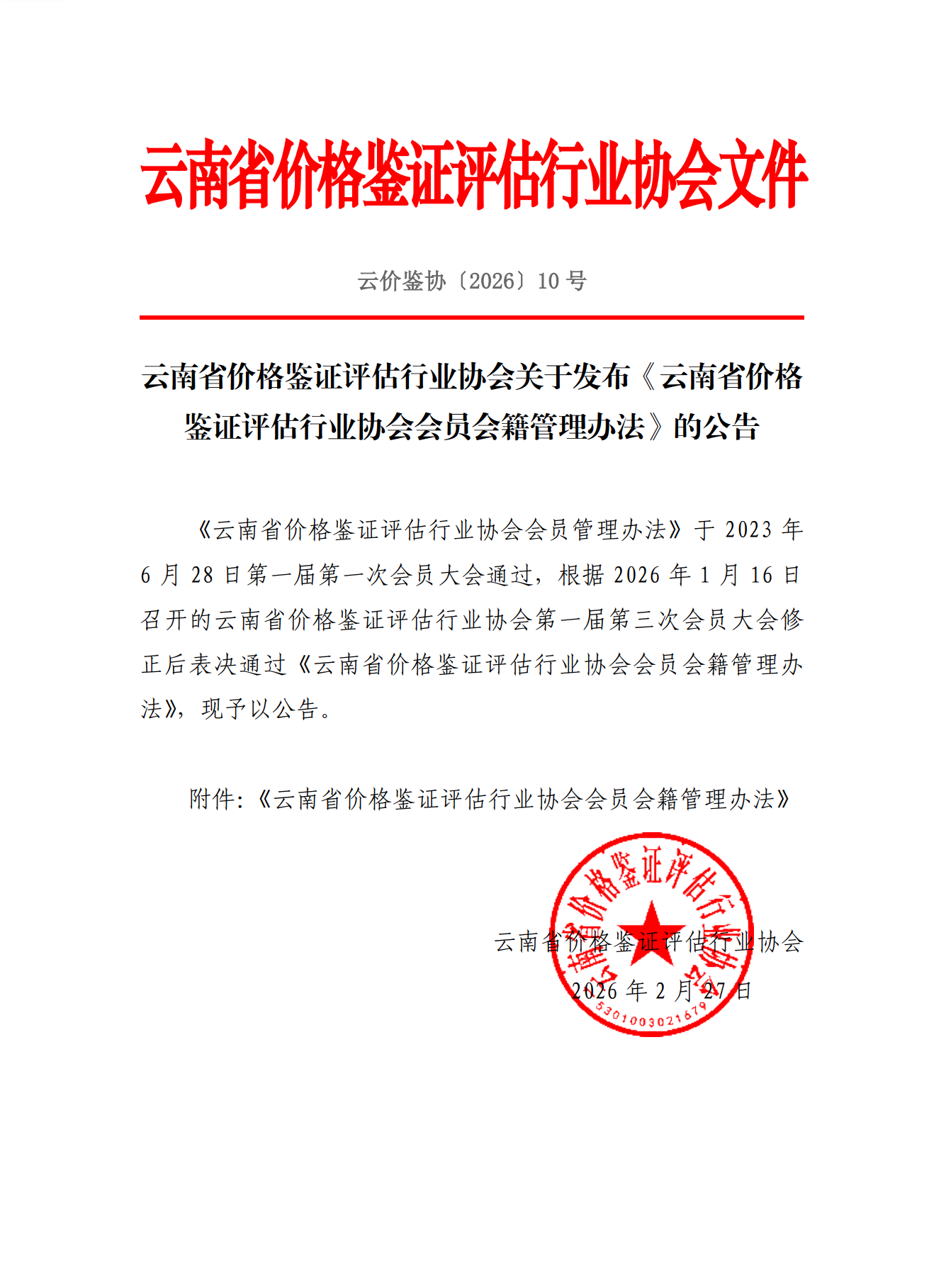 关于发布《云南省价格鉴证评估行业协会会员会籍管理办法》的公告