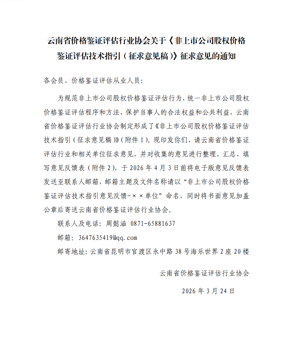> 关于《非上市公司股权价格鉴证评估技术指引(征求意见稿)》征求意见的通知